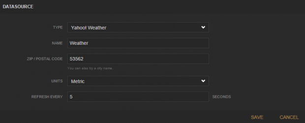 Es la fuente de uno datos abajo y dos para ir. Haga clic en el botón Agregar nuevo. Esta vez, en el menú desplegable tipo , seleccione Yahoo! clima. Como antes, un número de otros campos aparecerá una vez seleccionada esta opción. En el campo nombre , escriba tiempo. En el campo de Código POSTAL , de entrada su código postal. En el campo unidades , seleccione Imperial o métrico, dependiendo de su preferencia. En el último campo, Actualizar cada, entrada 5 segundos. Haga clic en Guardar.