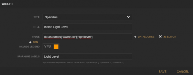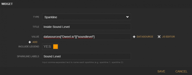 Ahora tenemos que agregar la pantalla real del sensor al panel, que se llama un Widget. Para ello, haga clic en el + (más) icono en la esquina superior derecha del panel, al lado del icono de la llave. En el menú desplegable tipo , seleccione minigráficos. En el campo título , Dentro del nivel de sonidode entrada. En el campo valor seleccionamos nuestro origen de datos de Dweet.io, entrada datasources["Dweet.io"]["soundlevel"]. En la Leyenda incluyen Deslice la palanca hacia sí. Por último, en el campo de Etiquetas MINIGRÁFICOS , entrada nivel de sonido. Por último, haga clic en Guardar.