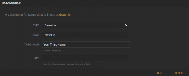 Ahora del pasado y probablemente más importante, origen de datos. Vamos a añadir un origen de datos de Dweet.io que Freeboard.io extraer información empujó a Dweet.io de nuestro sensor Arduino IoT. Otra vez, haga clic en el botón Agregar en la esquina superior derecha. En el menú desplegable tipo , seleccione Dweet.io. En el campo nombre , entrada Dweet.io. Luego, en el campo Nombre de la cosa , de entrada el nombre de lo que usted utiliza en su sketch de Arduino como se describe en el paso anterior. El último campo, clave, se dejará en blanco a menos que usted pagó por una clave privada en Dweet.io. Por último, haga clic en Guardar.