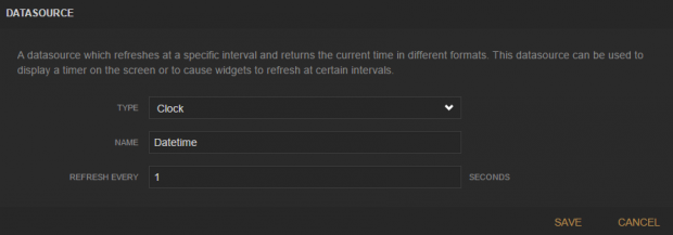 Comience haciendo clic en el botón Agregar en la esquina superior derecha de la pantalla. En el menú desplegable tipo , seleccione reloj. Una vez seleccionada esta opción, aparecerán dos opciones adicionales. En el campo nombre , dar este origen de datos un nombre que te permitirá diferenciarla de las otras fuentes de datos agregaremos, nombré mía Datetime. Luego, en el campo Actualizar cada entrada 1 segundo, que debe ser el valor por defecto. Por último, haga clic en Guardar.