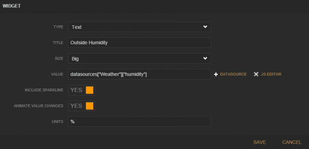 Haga clic en el + (más) el icono en el panel de tiempo otra vez y entrada todos los mismos valores que excepto dan este Widget un título de Fuera de humedad y en el campo valor , introduzca datasources ["tiempo"] ["humedad"].