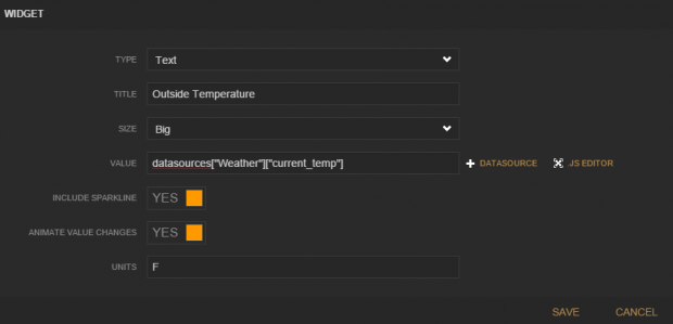 Haga clic en el + (plus) icono. En el menú desplegable tipo , seleccione texto. En el campo título , entrada Exterior de temperatura. En el menú desplegable tamaño , seleccione grande. En el campo del valor , entrada de datasources ["tiempo"] ["current_temp"]. Establecido el MINIGRÁFICO incluir y Animar cambios de valor en sí. Último, establecer las unidades para que se corresponda con el valor, Imperial o métrico, que para el origen de datos de Yahoo! clima y haga clic en Guardar.