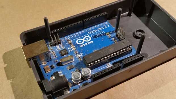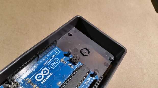Con las clavijas de montaje ajustadas hacia abajo, coloque la placa Arduino en el recinto del proyecto con el puerto USB y conector mirando hacia la parte inferior del recinto del barril.