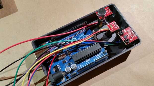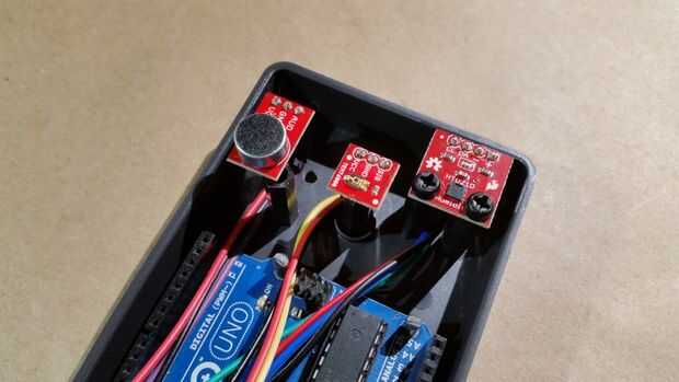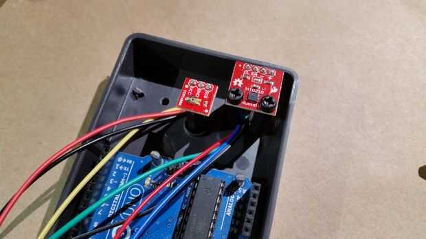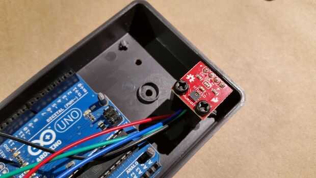 Los cables de los sensores deben pasar por encima de la Arduino y la parte inferior de la caja del proyecto, junto al puerto USB de Arduino y conectores jack de barril.