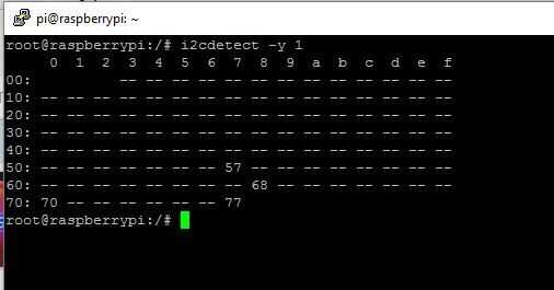 Parte de la instalación de I2C es ejecutar i2cdetect que debería verse como la imagen adjunta, si todo está cableado correctamente.