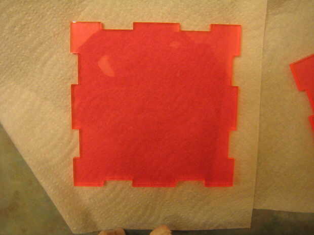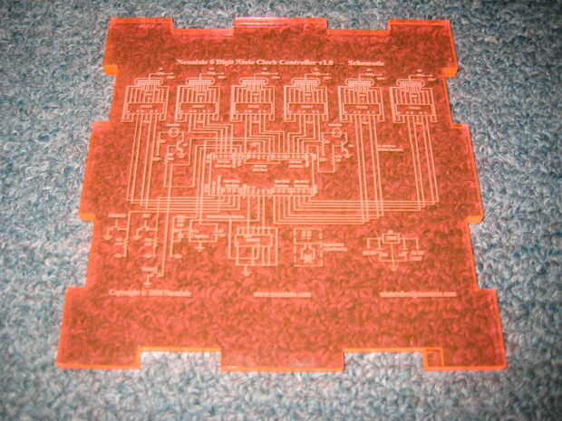Cortar los paneles de 12"X12"X.236 "plástico rojo fluorescente. Me propuse a pedido 1/4" espesor de plástico, pero terminé recibiendo plástico grueso de 6mm en lugar de otro. Tuve que rediseñar el caso para compensar esta nueva dimensión. Laser grabado el diagrama del circuito en el panel inferior tal como un homenaje a la tecnología de tubo de vacío era que era que el usuario pueda reparar y porque se ve genial grabado en el plástico.