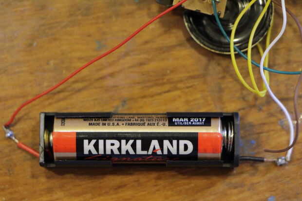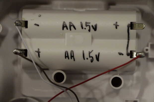 Encontrar los cables positivos y negativos conectados al mecanismo de reloj (en este caso rojo y blanco, véase fig. 1) y les de la soldadura para el portapilas (fig. 2). Generalmente, relojes estándar sólo tiene que ejecutar en una batería del AA, pero si quieres también la alarma y la función de LED, entonces usted necesitará dos. Para hacer las cosas simples, nos quedo con la versión única del reloj. En este punto, debe probar su reloj para ver si funciona. Ver el video de abajo.