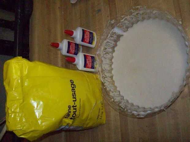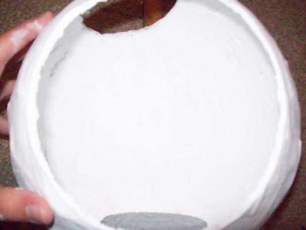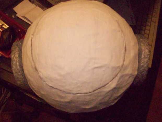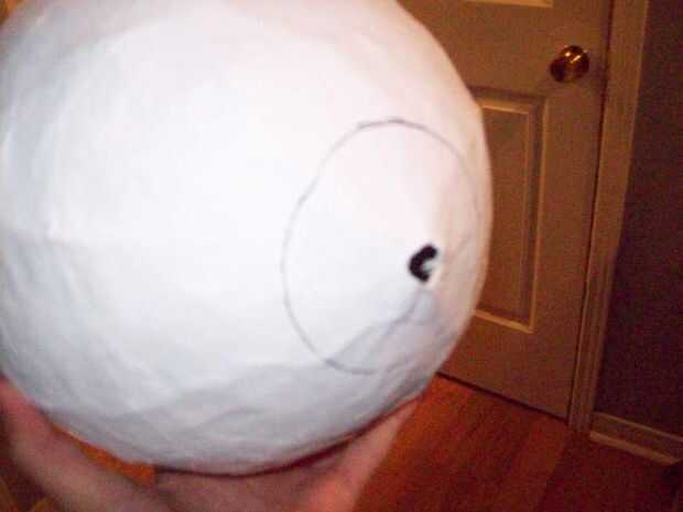 El cuerpo es esencialmente una papel maché bola que se pinta. Para hacer esto probablemente quiere agarrar su globo esférico y soplarlo hasta un volumen deseado. Debe ser suficiente para encajar el reloj interior y por lo que puede caber un pedazo de syrofoam circular pequeño a ambos lados.
