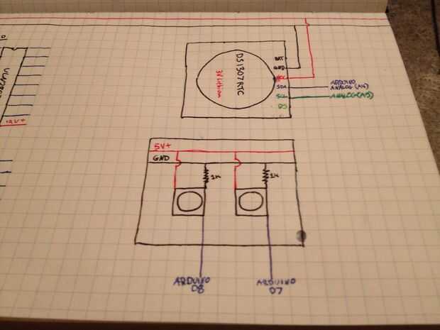 El chip RTC usé requerida sólo + 5V, GND y dos conexiones analógicas para Arduino. En el diagrama anterior, la parte superior muestra la RTC junto con sus conexiones.