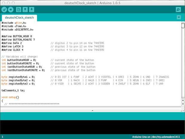 He creado un grande si / entonces estructura para establecer el registerBytes correcto para corregir posiciones de encendido/apagado basado en el tiempo de la RTC. Una vez que todos los registerBytes fueron instalados correctamente, luego empujarlos hacia fuera por updateShiftRegisters() llamando al: