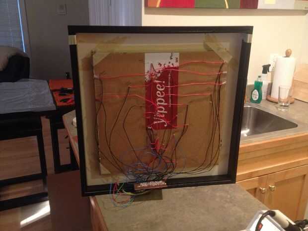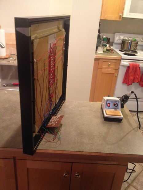 A continuación, os adjunto mi matriz de LED con el circuito a la estructura. Había suficiente espacio para la placa de circuito y Arduino en la parte inferior del marco de la.