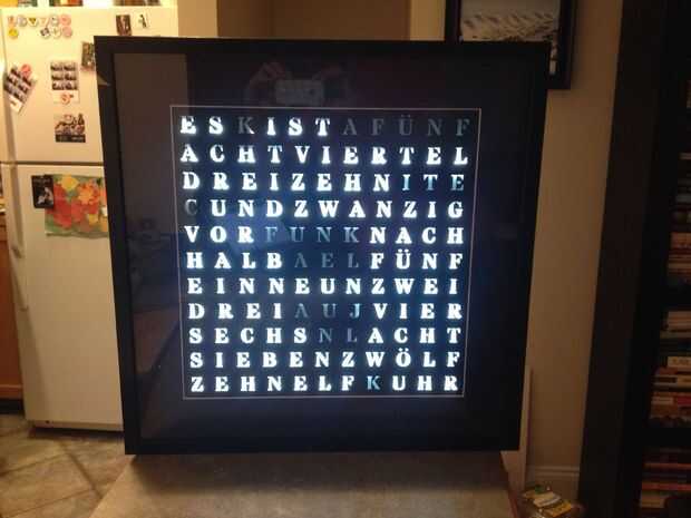 En la última foto puedes ver un tiro con todas las palabras iluminadas (excepto uno). Escribí un programa de prueba que se convertirían en todas las tiras de LED a ver si alguna de las conexiones se rompieron. Y como se puede ver en el ejemplo, la palabra de arriba-derecha "fünf" (cinco) de la placa de circuito.