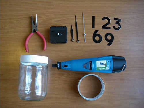 Usé un tarro encontré alrededor de la casa. El mecanismo del reloj vino de un reloj que encontré en una tienda de dólar. Las pegatinas número que he encontrado en una tienda fija.