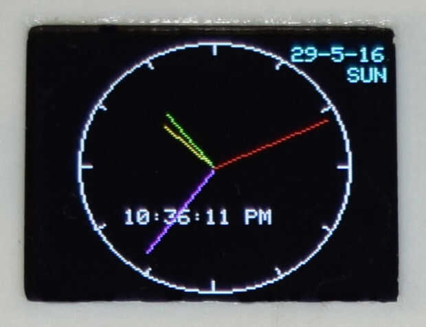 - En cada segundo, calcular el ángulo que cada mano se mueve en un segundo. Dibujar las manos con color de fondo para borrar lecturas de reloj anterior y dibuje tres manos: hora, minuto y segundo según ángulos actuales.