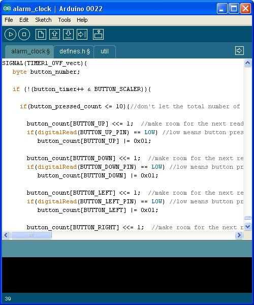 manual a lo que el entorno de Arduino, es el siguiente paso. El manual lo llama "TIMER1 OVF" y lo describe como "El desbordamiento del temporizador/Counter1". El archivo (en mi sistema) "C:\arduino-0022\hardware\arduino\bootloaders\stk500v2\avrinterruptnames.h" tiene una lista útil de todas las interrupciones posibles. El "TIMER1_OVF_vect" uno se parece a un partido y es lo que me fui con. Ahora sólo tienes que buscar la fuente de Arduino para el uso de esa interrupción (Notepad ++ es lo que uso para esto). Usted puede verificar el código pero declaro las rutinas de interrupción: