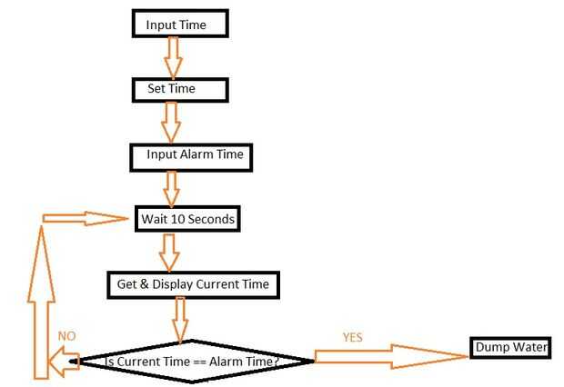 Codificado mi Arduino para obtener información sobre el tiempo actual y el tiempo de alarma deseada. La pantalla LCD aparece la hora actual y el tiempo para que la alarma fue fijada. Cuando llegó el momento de la alarma se apague, dije el servo para girar, volcar la botella de agua y dejando que la gravedad verter sobre mi cara. Usted puede encontrar mi código de aquí. Mi servo entonces se rompió, así que lo hice otra vez con un pequeño motor. El código es casi lo mismo, pero lo puedes encontrar aquí.