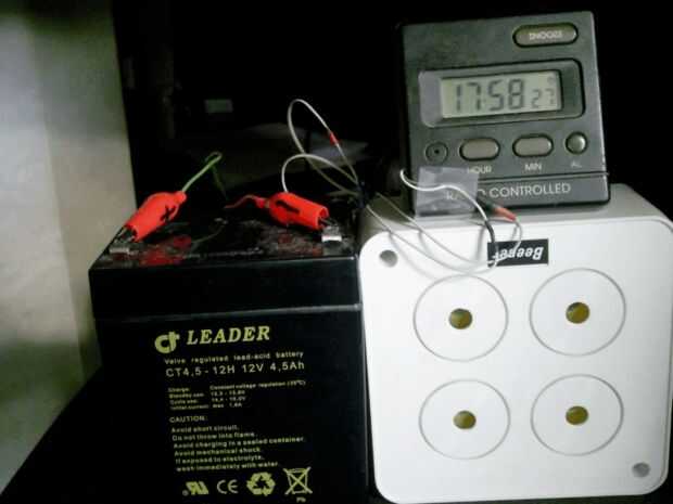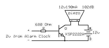 Usé mi batería por radio controlado reloj despertador (3v) una sirena de alarma 12v 190mA 102dB con 4 piezas en ella. Una batería de 12v para el piezo. Todo lo que necesitaba entonces era uno de muchos transistores KSP2222A reciclé de una fuente de alimentación ATX de defecto y una resistencia de 680 Ohm.