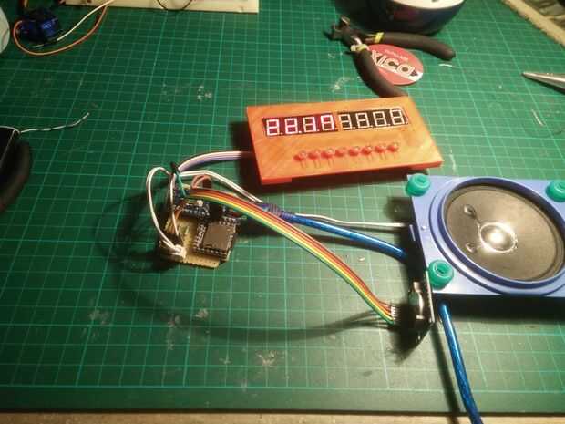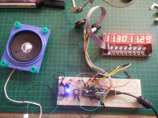 Afficheur TM1638, branchement: datos pin D8(sur l'arduino), reloj pin D9(sur l'arduino) et pin strobe D7(sur l'arduino)