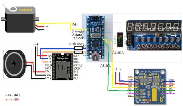 Dfplayer Mini, RX (D10 sur l'arduino avec une résistance ohmios de 1 k), TX (D11 sur l'arduino avec une résistance de 1 k ohmios)