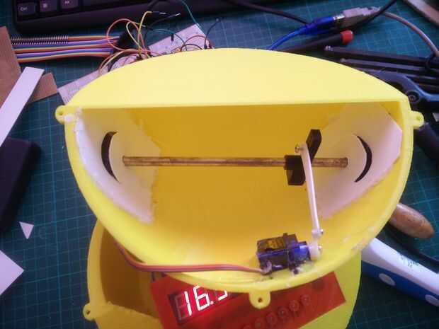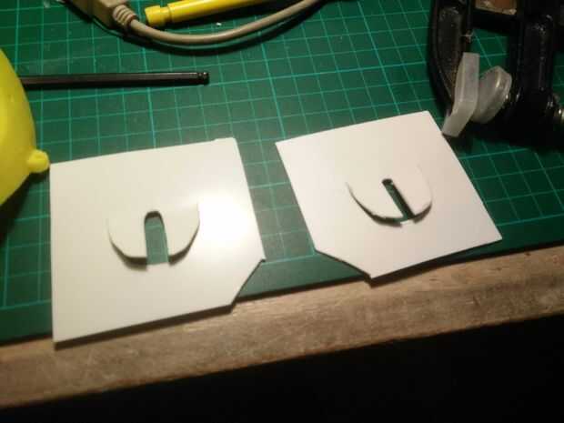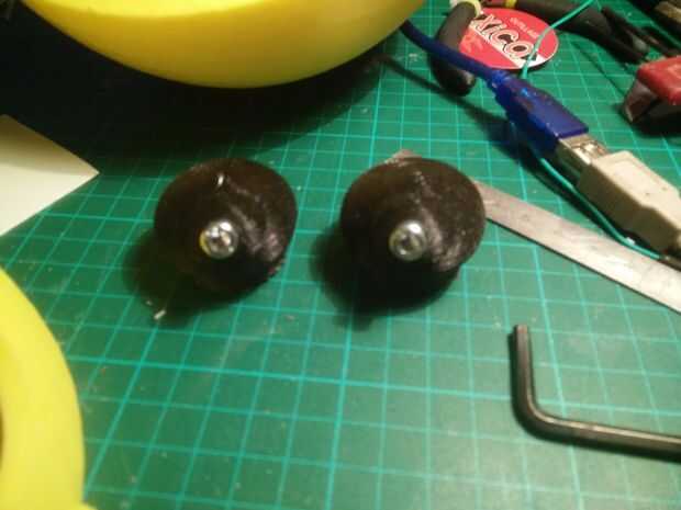 Corte 2 piezas de plástico blanco (estireno en mi caso) a ojos de la ayuda, utilizar una varilla o un palo para conectar los ojos y el brazo (ya imprimido) del enchufe de un actuador (tengo el motor servo de cola).