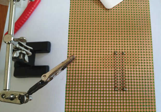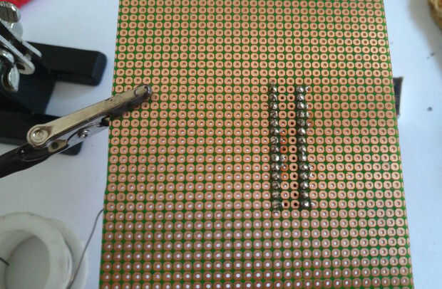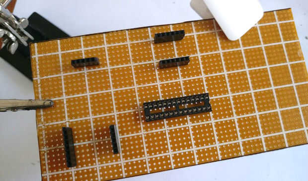 Empecemos por soldadura nuestros componentes principales a nuestra perfboard. Antes de que la soldadura, asegúrese de dejar suficiente espacio otras partes y alambre. Usando un zócalo del IC es mucho mejor que soldar directamente el ic, porque es más fácil quitar el IC si se ha dañado. Me gusta utilizar cinta adhesiva para sujetar los componentes en su lugar mientras se suelda. estoy usando pernos de cabecera para conectar 7seg led, módulo rtc y FTDI breakout Junta o USB al adaptador Serial TTL (utilizado para programa de IC el) a la Junta de perf.