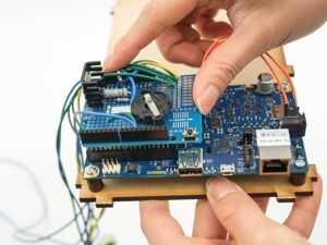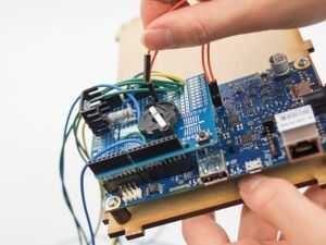 4. Conecte los cables de dos puentes de la placa Intel® Galileo Gen 2 a la Asamblea protoshield