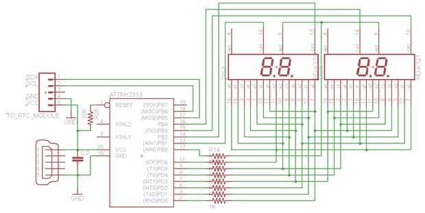 Con pequeña 2313, todavía tienes bytes de memoria a la izquierda y repuestos 3 IO... Con esto todavía puede añadir un altavoz peizo y reproducir algunas canciones funky cuando el reloj llega a la hora...