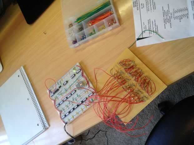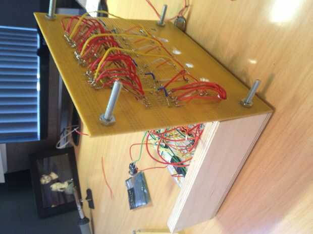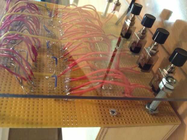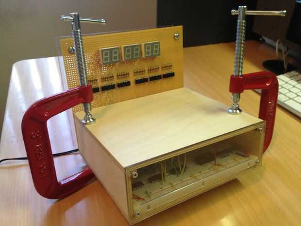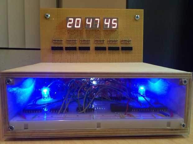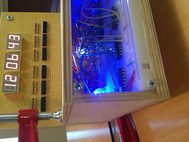 No incluido en el esquema es un oscilador de cristal KHz 32 (digikey.com pieza Nº DS32KHZ/DIP-ND) que se divide hasta 1 Hz usando un contador de 14 bits y un flip-flop JK en el modo toggle. Esa señal se alimenta entonces en el primer contador de la secuencia que se utiliza para la porción de segundos del reloj. Los interruptores usados para el tiempo establecido son pulsadores momentáneos de SPDT. Cuando pulsa y mantiene, se transmite la señal de 1Hz a la broca específica, que lo hace temporalmente la cuenta a una velocidad de 1 segundo. Entonces se suelta el botón cuando alcance el valor deseado. El azul brillante que se percibe en el interior del reloj LED puede dar vuelta encendido o apagado (puede ser un poco molestos cuando en la noche) con un básico on/off interruptor de palanca que ha creado en la parte posterior del reloj entre el momento de botones. Todos otros circuitos no relacionados con hardware, madera, etc. fue adquirido en el hogar Depot.