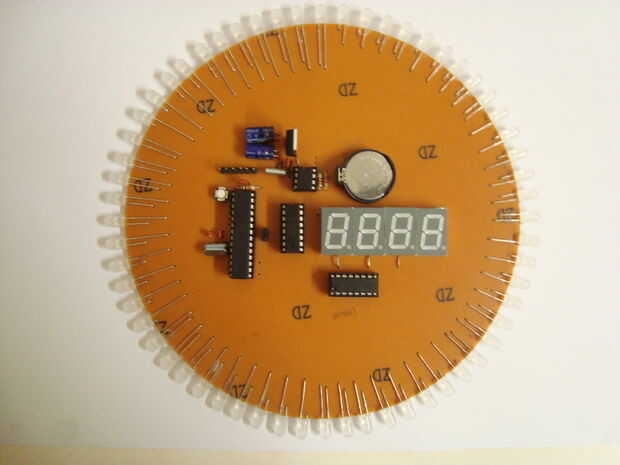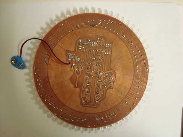 Hacer las marcas sobre el PCB para marcar los minutos lugares donde los LEDs a soldar. Usé un transportador. cada minuto es de 6 grados de separación.