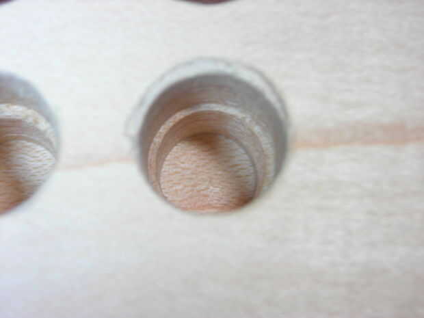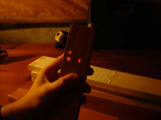 Alinee la broca con un agujero de prueba y suavemente presionado durante 1 segundo y deje para arriba. Manténgalo presionado por 1 segundo otra vez entonces dejado y apague el taladro. El taladro está apagado así que usted puede raspar cualquier acumulación de la parte inferior de la broca. Si no, se quemará el agujero haciendo la cara descolorada. Repetir este proceso hasta que estés contento con cuánta luz brilla a través de (ver fotos a continuación para una referencia).