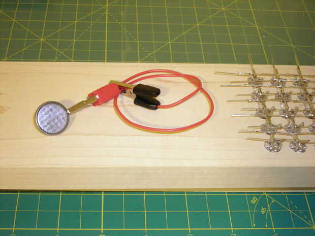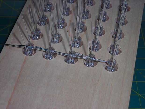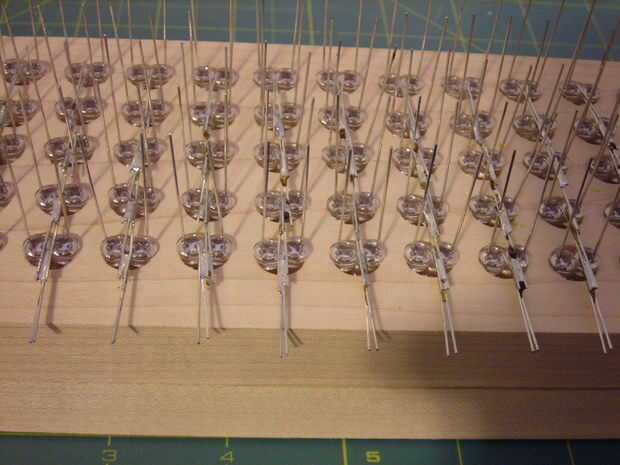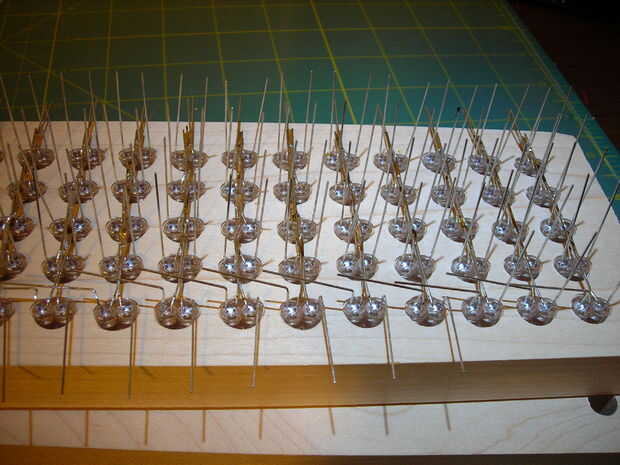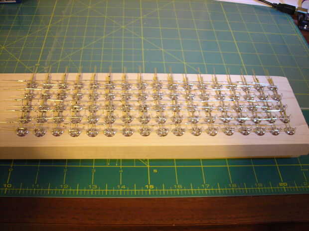 Soldar los ánodos junto primera doble de ánodo de un color hacia arriba y luego estirarlas horizontalmente, por lo que hay 5 filas de ánodo para ese color. Doblar el otro color de ánodo conduce hacia abajo y luego horizontal, para que formar filas de ánodo 5 otro.
