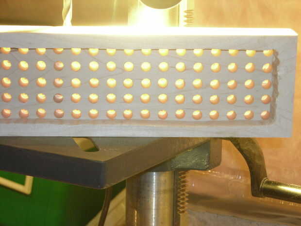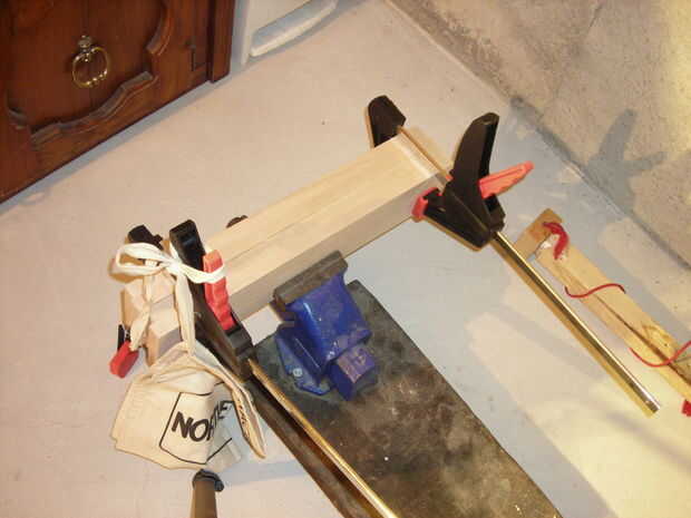 Para hacer un fuerte lazo, coloque un pedazo de madera 'sacrificio' a ambos lados de las piezas ya pegadas y afiáncela con abrazadera juntos (Asegúrese de alinear rápidamente, porque se seca rápido). Para hacer el mejor sello, pinza con todo lo que tengas (ver) segunda imagen abajo, pero tenga cuidado de no romper la madera o empujar hacia fuera los agujeros de LED.