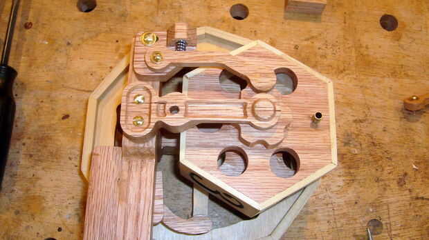 Brazos con resorte paseo en levas de cada una de las horas, decenas de minutos y minutos las ruedas al mantener los dígitos en su lugar después de que se mueven. Trabajado a máquina los brazos y soportes de roble. Los resortes pequeños vinieron de mi tienda Ace hardware. Los brazos son ajustables para la tensión y posición. Demasiada tensión provoca tensión en el motor; a poco hace que los dígitos a ser desalineados cuando en descanso. La posición de ajuste permite que las ruedas a girar un poco para que estén alineados los rostros de los dígitos visibles.