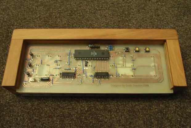 Para el caso, puede utilizar casi cualquier cosa. He utilizado Rimu, una madera nativa de Nueva Zelanda. Usé un molino para cortar pistas y nichos para el "sándwich" de la Junta, reflector, difusor y ventana para sentarse en y las diapositivas del conjunto en de la parte inferior. También hay una hendidura delgada en la parte trasera del reloj en, esto es hecha de una fina lámina de plástico. Botones para pulsar los interruptores fueron dadas vuelta para arriba en un torno.