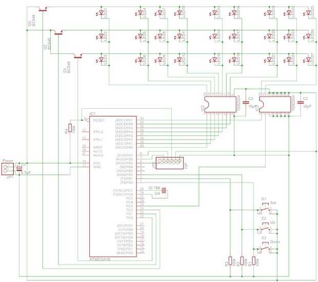 Aquí hay un video del reloj en acción y un archivo zip que contiene el código básico de Bascom AVR, esquemático y PCB. Si haces clic en el esquema se puede ver tamaño completo.
