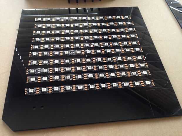 La base del reloj es una matriz de LED. Los LEDs funcionan actualmente como una tira pero tenemos que hacerlos más cuadrado.