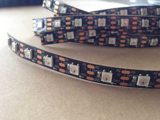 3. Soldar los LEDs: en una serpiente como manera Conecte los tres (positivo con positivo, negativo con negativo y a datos)