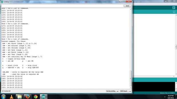 El código es escrito por "David H. Brown" lo uso simplemente para darle una introducción para el DS1307. De todos modos el Arduino se comunica con el módulo RTC y actualiza la hora cada segundo a través del Monitor de la serie. El creador nos ha dado una opción para ajustar la hora cuando envía el comando "?". Aparece el siguiente menú.