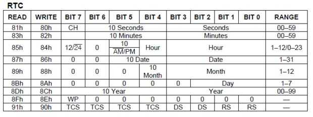 Los 31 bytes de memoria RAM tiene el formato como se muestra en la siguiente tabla. Observe que las posiciones numéricas tienen sus propios bits para llenar. Específicamente el 0-9 valor de los' ' lugar tiene 4 bits y 0-9 valor de las 'decenas' lugar tiene 3 bits para el byte con el valor de segundos. Estos valores se combinan para crear el octeto completo.