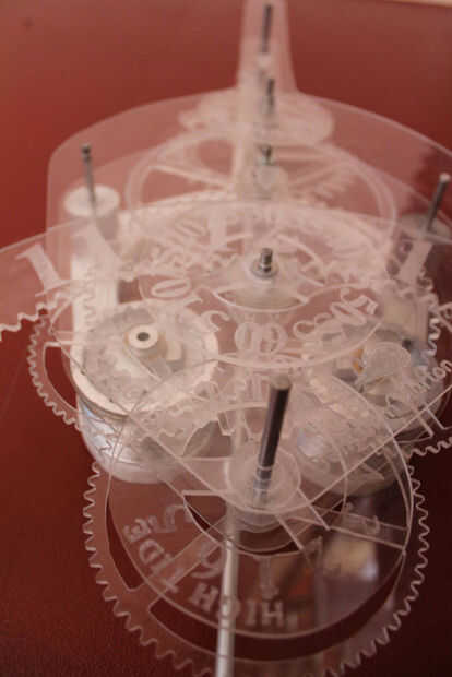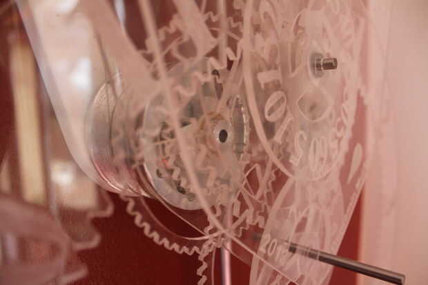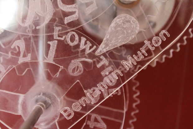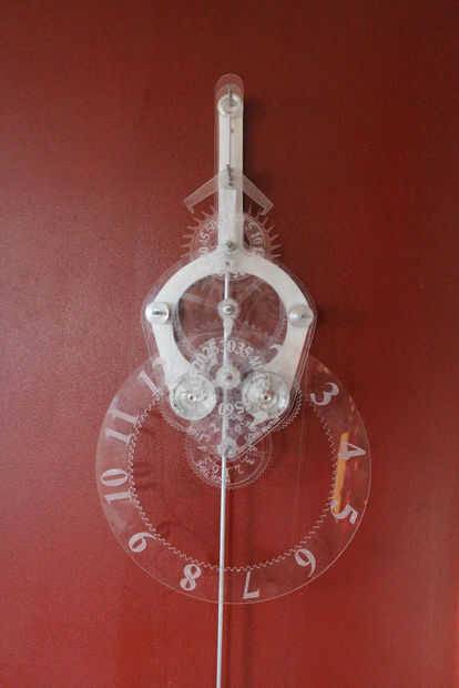 el uso de acrílico para un material de construcción principal se decidió hacer una nueva pieza de la característica, también es un material más sencillo para trabajar con, con la limitada maquinaria encontrará en un taller del colegio. El reloj es totalmente mi diseño y llevó a cerca de 13 semanas con aproximadamente 16 horas a la quincena. Quería algo un poco diferente del reloj estándar con tres manos y diseño circular, quería incluido el aspecto y el funcionamiento mecánico en el viejo reloj de abuelo y esqueleto. Aquí es donde el diseño abierto de modo funcionamiento todos es accesibles para que puedas ver cómo funciona.