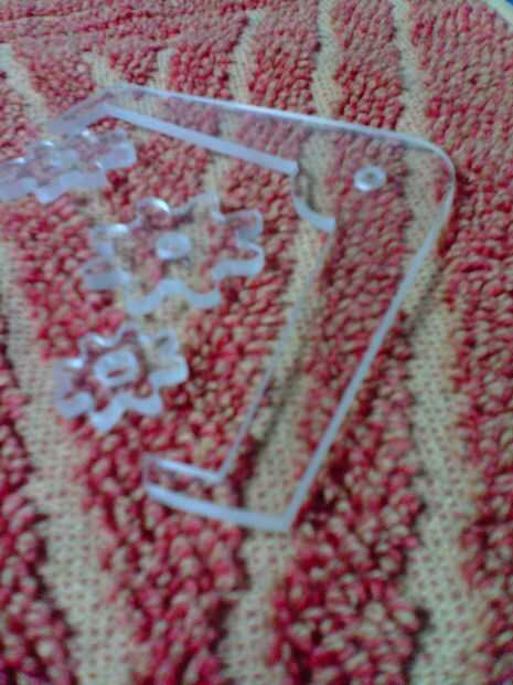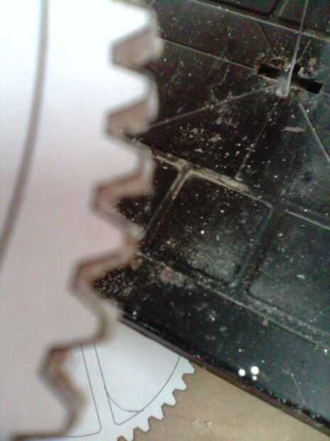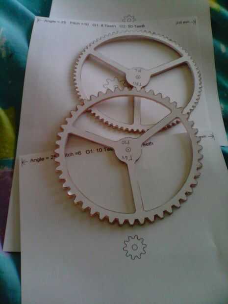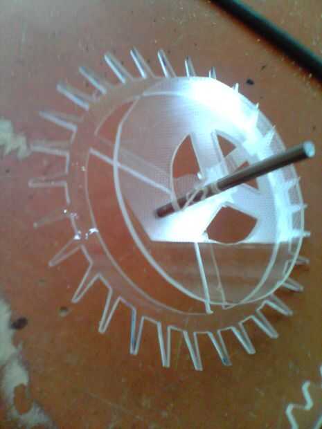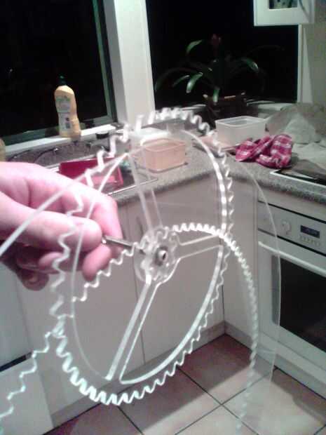 Los engranajes acrílico eran la parte más desperdiciador de tiempo de la construcción. cada engranajes fue cortado a mano en una puerca de desplazamiento entonces archivado a la forma final. Hay más de 400 dientes que se forman individualmente por lo que esto tomará tiempo.