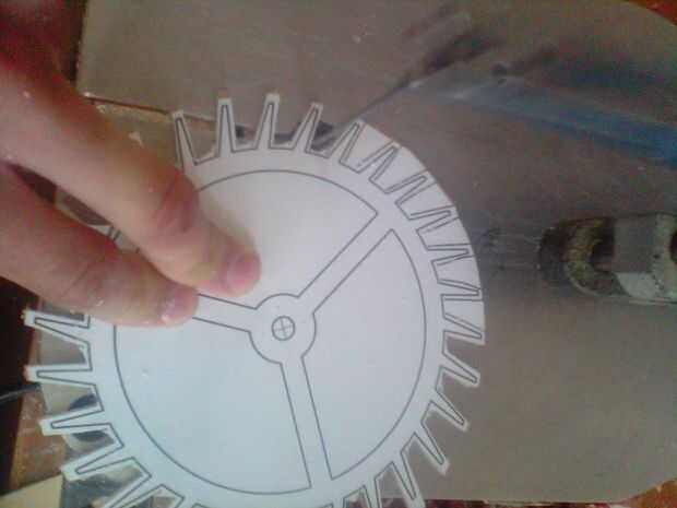 El primer paso es imprimir las plantillas de engranajes desde el generador de plantilla de engranaje encontró en el paso de diseño y los tamaños de los engranajes se pueden encontrar en este enlace https://drive.google.com/file/d/0B4V1Ma-qByctNG1hRGQ2aGd4blE/edit?usp=sharing. Pegar la plantilla sobre el papel que cubre en el acrílico para asegurarse que sea plana y no deformado.