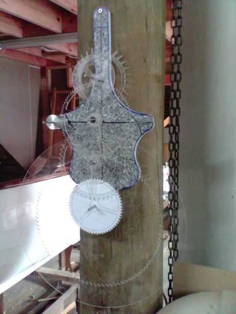 Las otras partes de la estructura son los ejes que los engranajes giran redondo y una capa transparente de acrílico en la parte frontal del reloj y uno en el centro, actuando como una especie de separador, éstos tienen los mismos agujeros y la forma como la parte posterior del pedazo así la misma plantilla puede ser utilizada. Verá dos cuadros diferentes en este reloj, el primero de ellos es de color gris y uno nuevo es de color blanco. Cambié la mitad porque cambié el péndulo. Si usted sigue el diseño del viejo nuevo funciona bien. Los ejes se realizan en la base con un rozamiento y un poco de pegamento, no hacerlo hasta que el reloj funcionaba como el marco de los ejes en por sólo fricción y terminé desmontarlo varias veces. Como los engranajes de este respaldo podría ser laser o CNC corte que reducir considerablemente el tiempo de producción y hacer mucho más precisa.