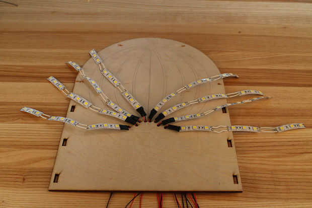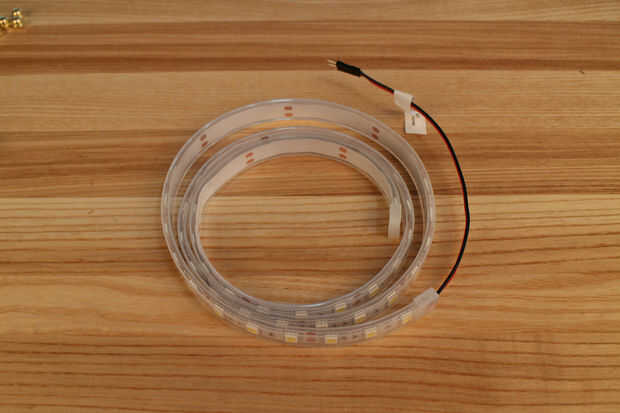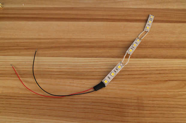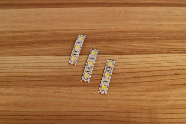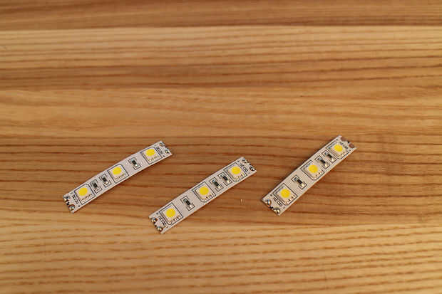 Desenrollar la bobina LED y cortar la tira de 16 piezas de 3 LEDs. La tira tiene almohadillas de cobre cada 3 LED para la alimentación y tierra.
