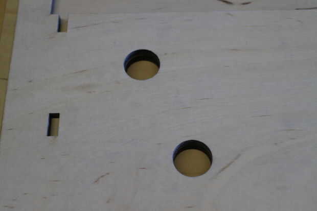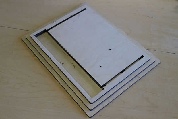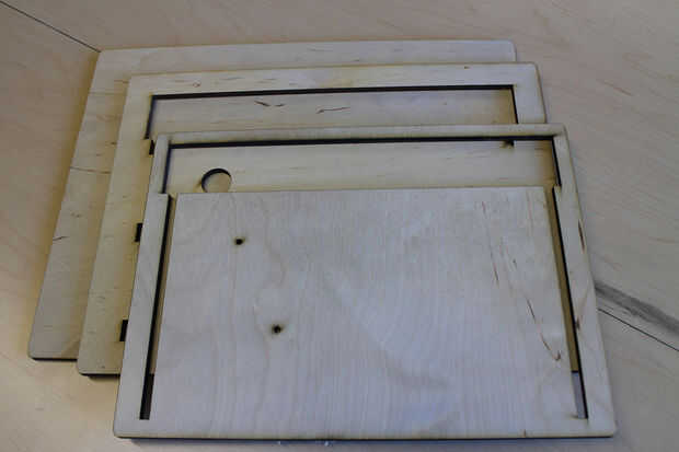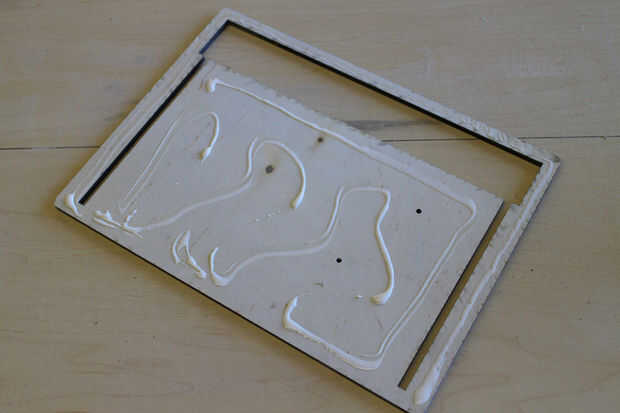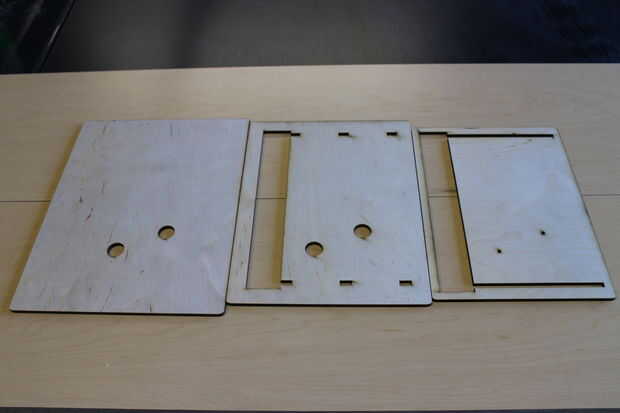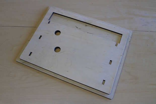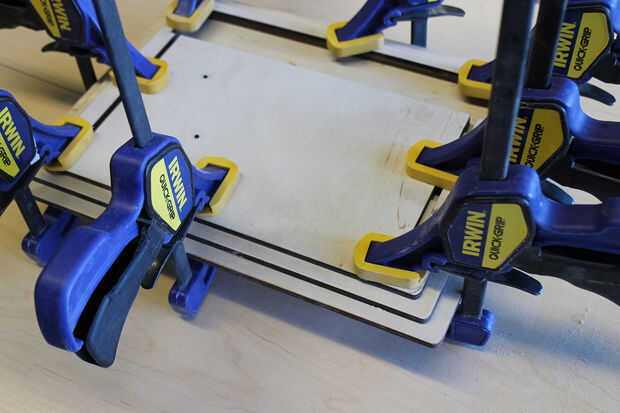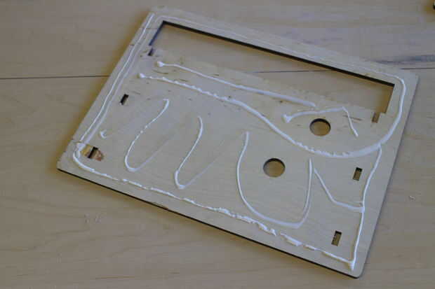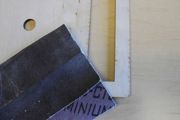 Coloque las tres piezas base sobre una superficie grande. Con papel curso arena, retire el láser antiestéticas quemaduras y sap carbonizado de los bordes. Tomando nota de la disposición apropiada, dé vuelta las dos piezas superiores y cubrir con pegamento de madera. Coloque la pieza central sobre la base, utilizando los agujeros del dedo como guía para alinear correctamente los. Coloque la pieza de arriba a la placa media, utilizando la ranura de cuerpo rectangular grande como guía. Fije las piezas base juntos y dejar para secar durante 24 horas.