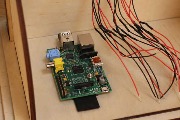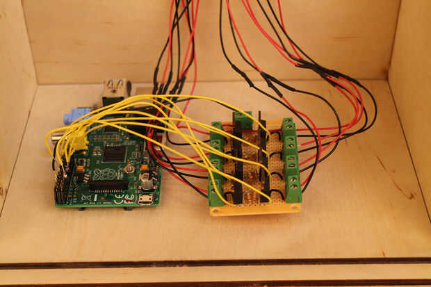 Monte la frambuesa Pi sobre los dos orificios izquierdos con los tornillos de 4/40. Conecte los cables de las tiras a la tarjeta de conductor, refiriéndose al esquema en el paso 7 (los cables de la izquierda mirando la parte posterior se unen al más bajo número de pin).
