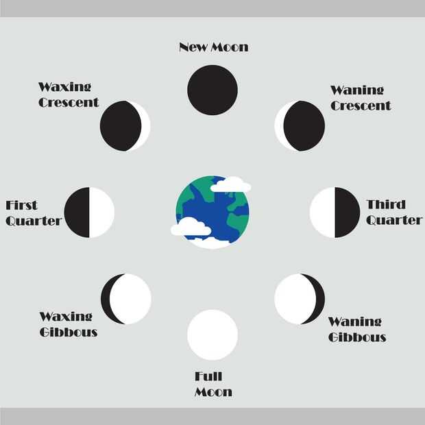 Al igual que las órbitas de la tierra al sol, así también la luna orbita la tierra. Mareas, la luna está bloqueada a la tierra, que quiere decir que porque la luna completa su rotación en el mismo tiempo que se tarda en orbitar alrededor de la tierra, siempre vemos el mismo lado de la luna. Mientras que nosotros podemos ser pegados a la misma vista de la luna, la relación entre la tierra y el sol como la luna completa su órbita está en constante cambio. Esto significa que se enciende en distintos grados (¡ o no!) y tendrá una forma distinta. Estas diferentes formas son lo que llamamos las fases lunares. La luna completa un ciclo alrededor de la tierra cada 29,53 días; Esto se conoce como Mes sinódico.