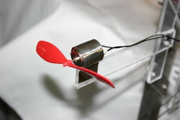Monte el motor y la hélice en la parte izquierda usando cinta de aluminio o cinta adhesiva.  Pase los cables al poste de centro.  La hélice debe tirar a la izquierda cuando está activo.
