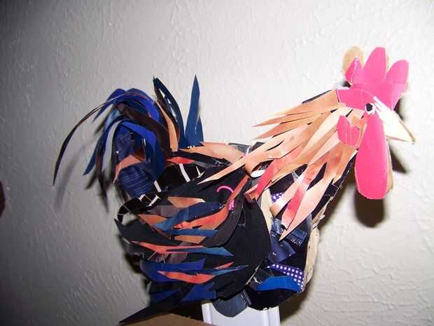 El diseño fue como se muestra en la primera foto. El reloj de madera con un gallo en la parte superior. Pero no tengo la paciencia para conseguir el reloj, caja de madera etc.. Decidí hacer todo lo del tablero de tarjeta. Esto fue hecha totalmente de materiales reciclados/reciclado.