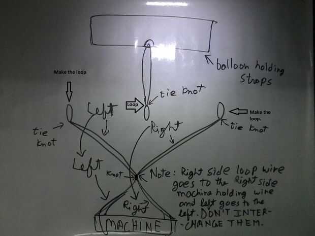 Los cables que vienen de la máquina, primero unirlos con un nudo apretado en el medio [atarlos con otro trozo de alambre] luego separar ambos a sus esquinas designadas (como se muestra) para que tanto las asas se queda en la misma altura cuando. Hacer los bucles (suficientemente grandes como para dejar un lápiz como palillo pasar) tal como se muestra en el diagrama siguiente, en el extremo de los cables izquierdo y derecho.